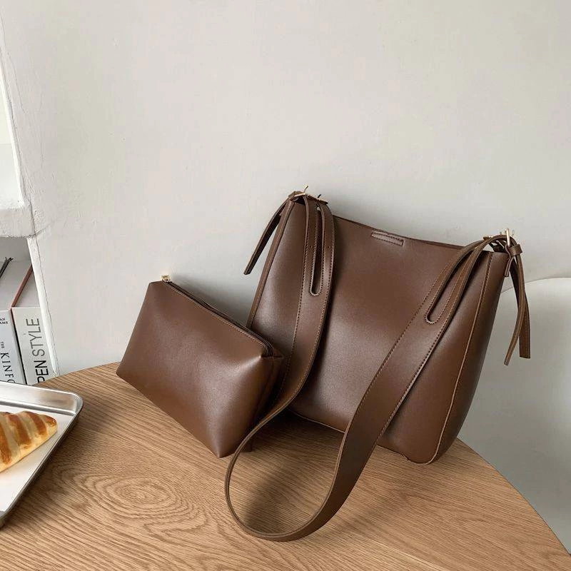 Cartera confeccionada en material de acabado liso y resistente, con un diseño práctico y minimalista. Incluye un neceser a juego que facilita la organización de objetos más pequeños. Presenta correa al hombro de largo cómodo y cuerpo estructurado que permite llevar lo esencial con estilo. Una opción versátil y funcional para el uso cotidiano.