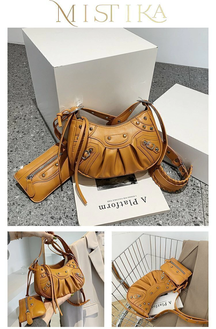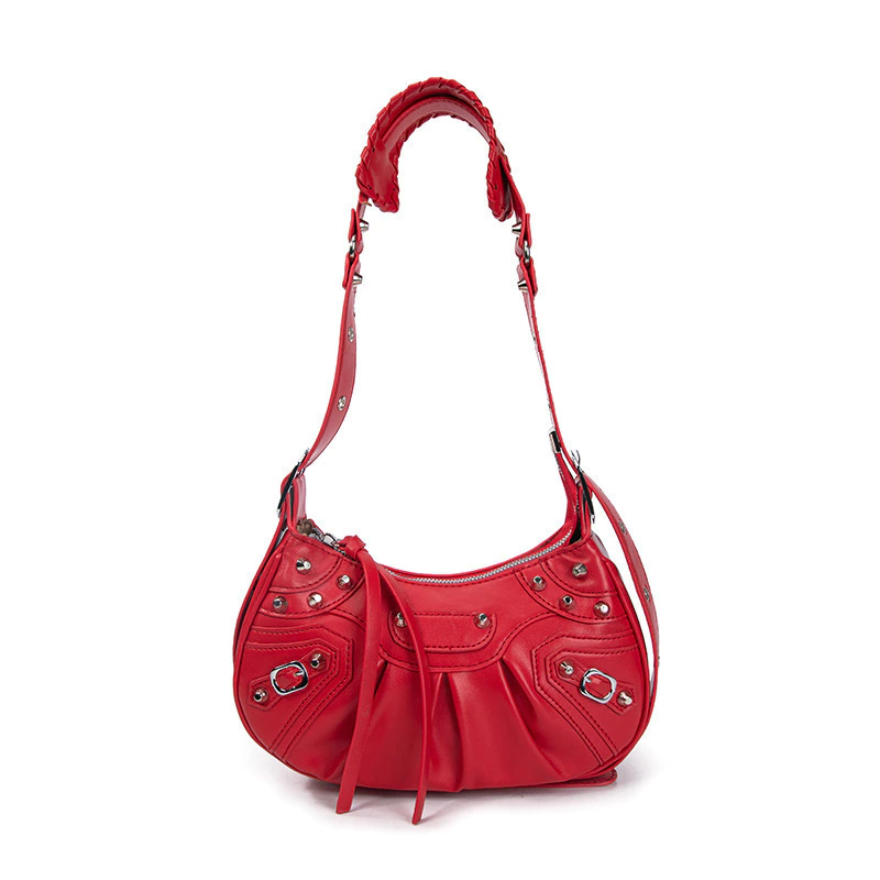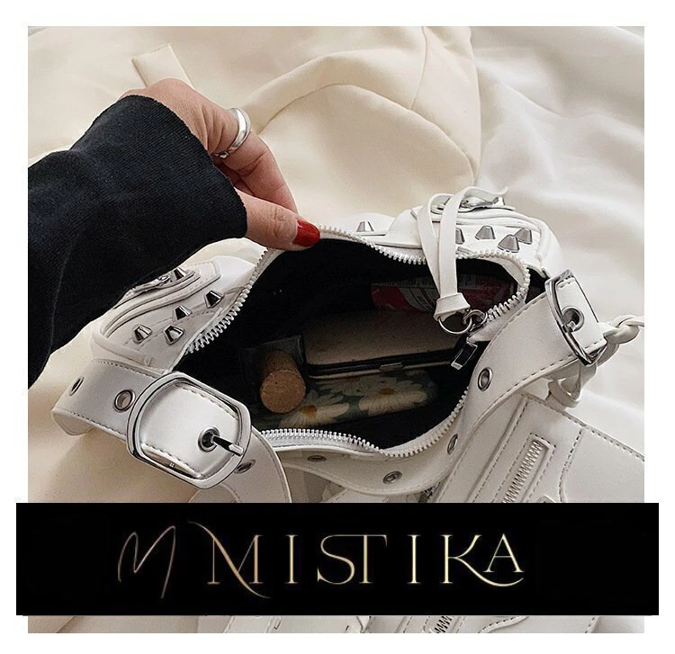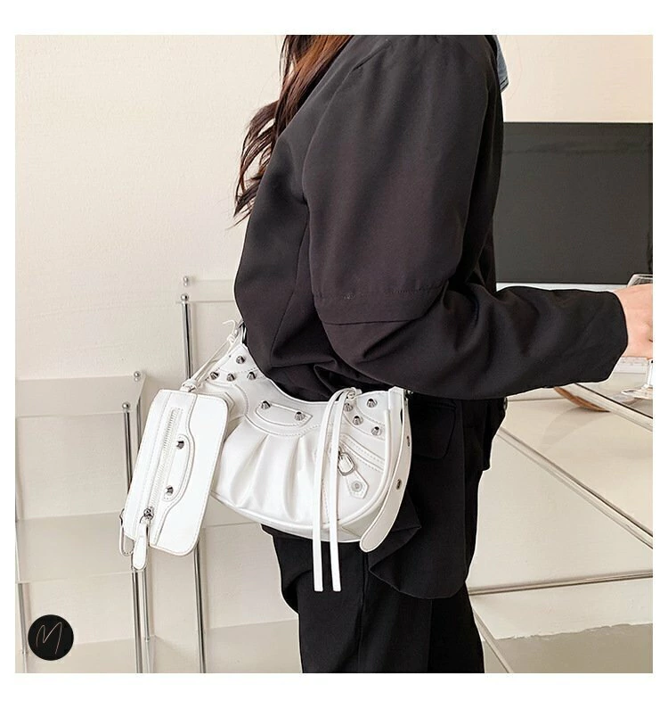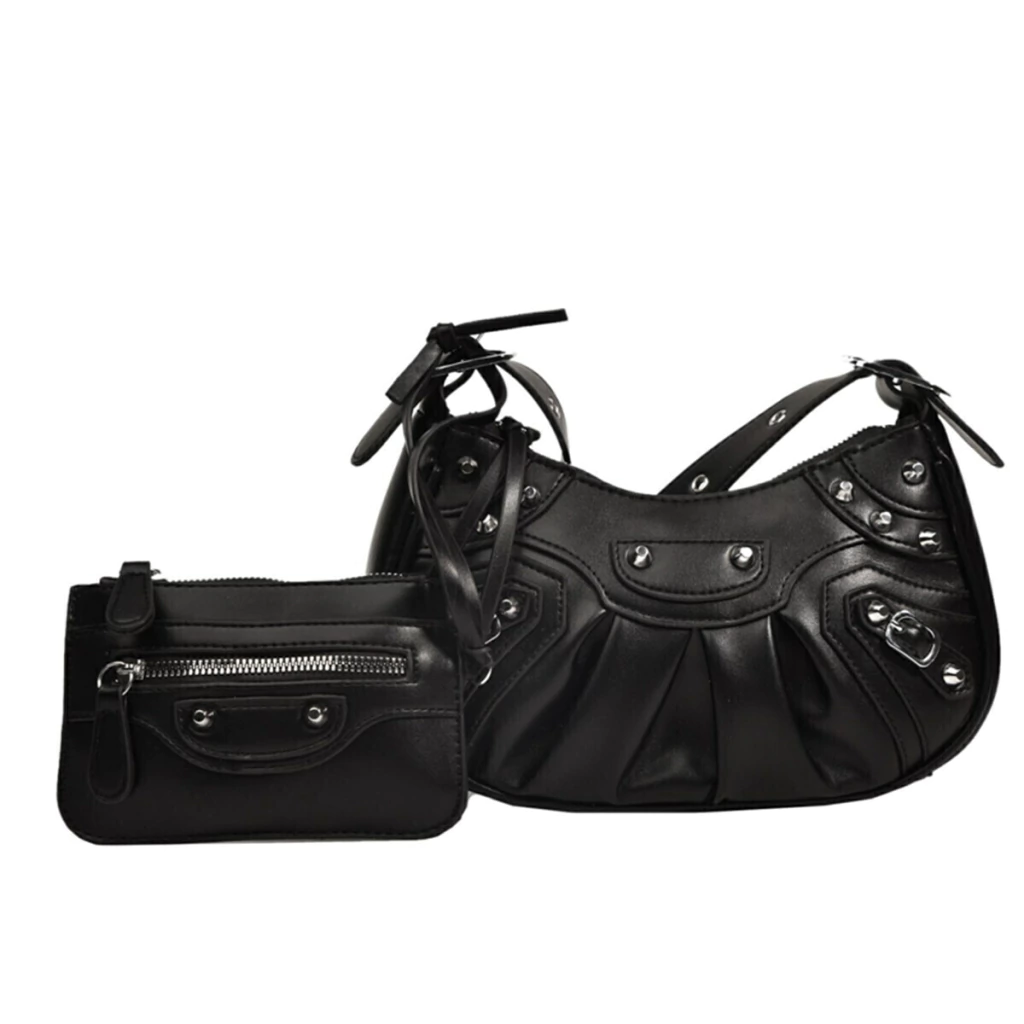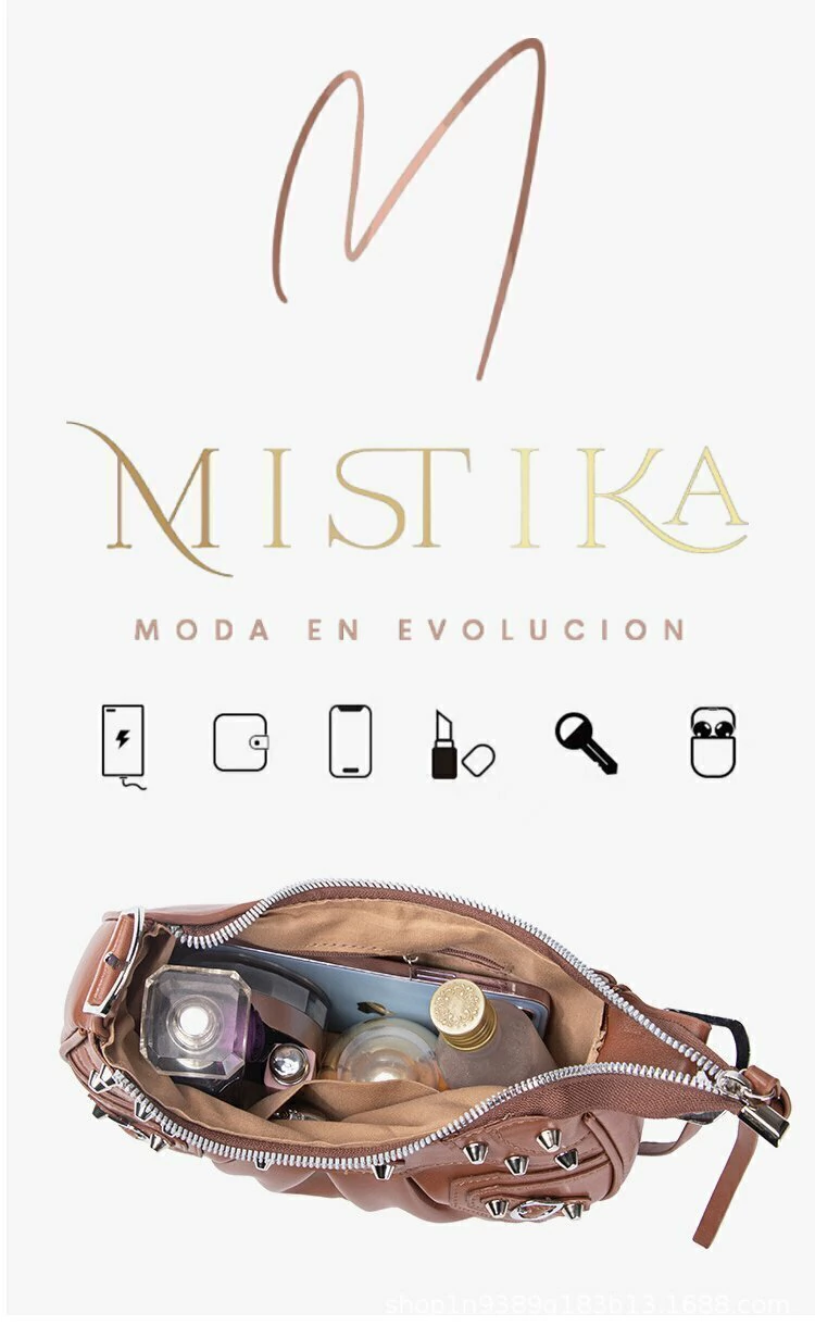 Cartera de mujer importada tipo bandolera estilo moderno y versátil, ideal para complementar cualquier outfit. Fabricada con materiales de alta calidad y detalles metálicos en tachas y hebillas que le aportan un toque único y sofisticado. Cuenta con cierre seguro, diseño compacto y funcional, perfecta para llevar tus esenciales diarios.