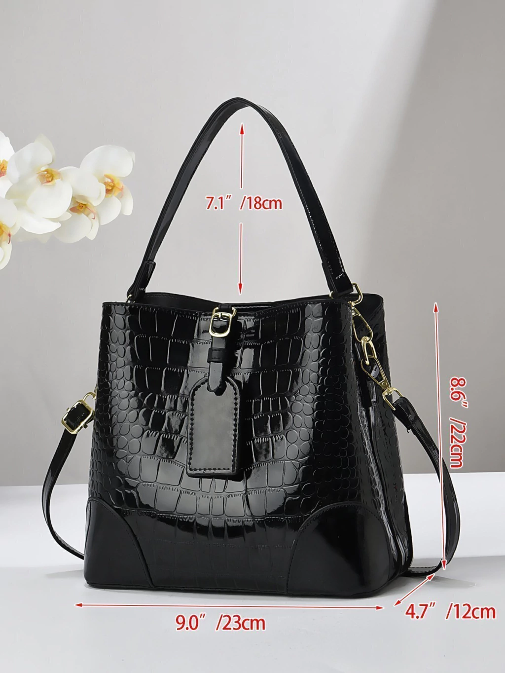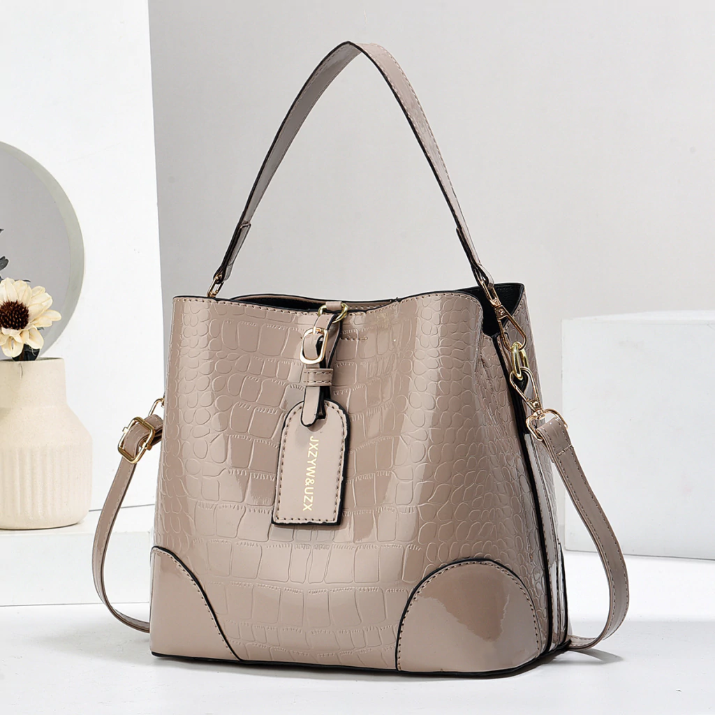 Cartera tipo bucket confeccionada en material símil cuero con textura grabada estilo croco, que aporta un toque sofisticado y moderno. Posee una correa larga regulable y desmontable para usarla como bandolera, además de una manija corta para llevarla en la mano. Su interior espacioso permite organizar fácilmente lo esencial del día a día, combinando practicidad y diseño elegante. Ideal para acompañar looks urbanos y casuales con un toque de distinción.