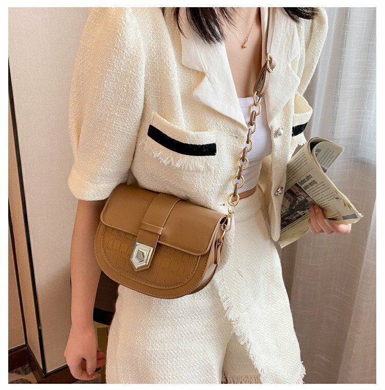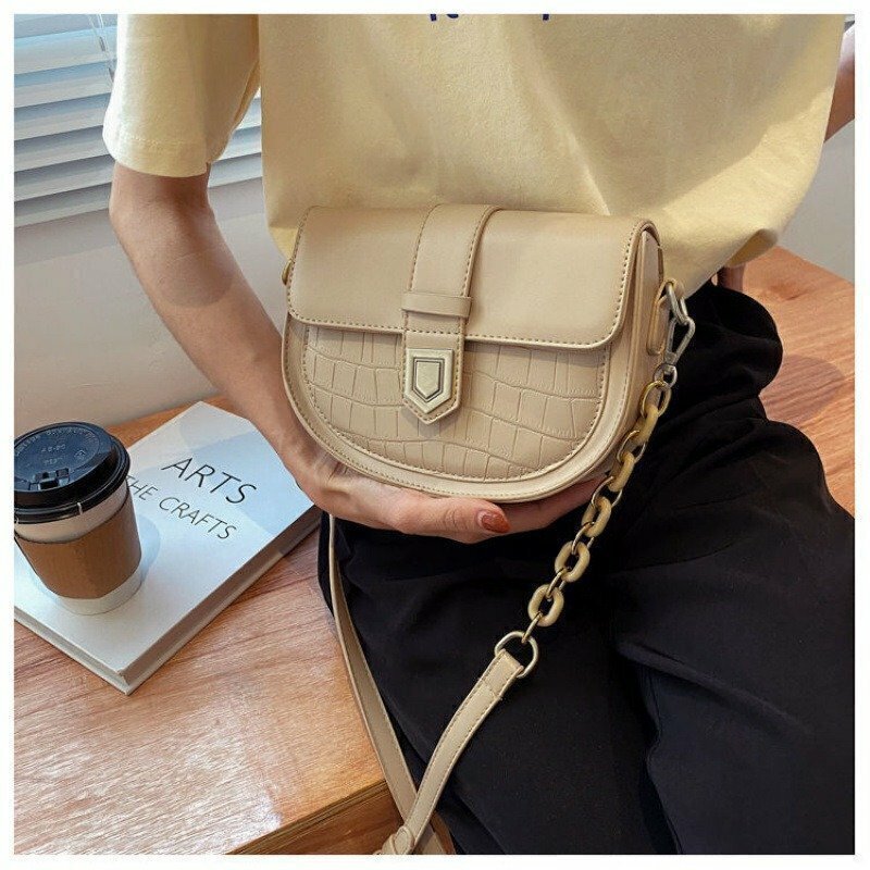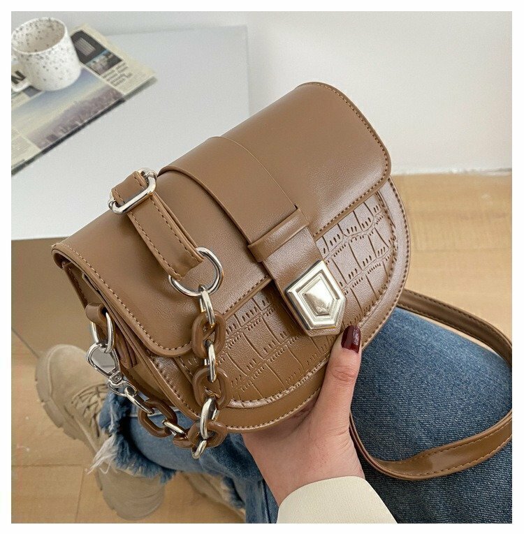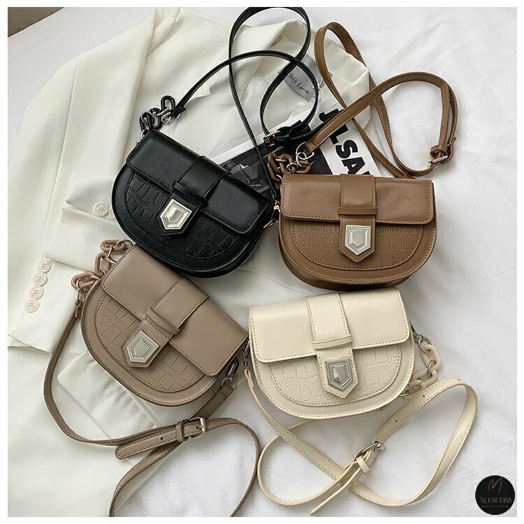 La cartera modelo Roma presenta un diseño elegante y estructurado, ideal para complementar tanto atuendos casuales como más formales. Su forma semicircular le da un toque distintivo y moderno, mientras que el detalle de textura tipo cocodrilo en la parte frontal añade un aire sofisticado. Cuenta con una solapa principal con cierre magnético adornado por un herraje metálico de forma geométrica, que destaca por su acabado plateado. Además, incluye una correa ajustable con hebilla y cadena lateral decorativa, también en tono plateado, que aporta un estilo urbano y contemporáneo.